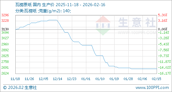 2月16日,生意社瓦楞原纸基准价为2680.00元/吨,与本月初持平。