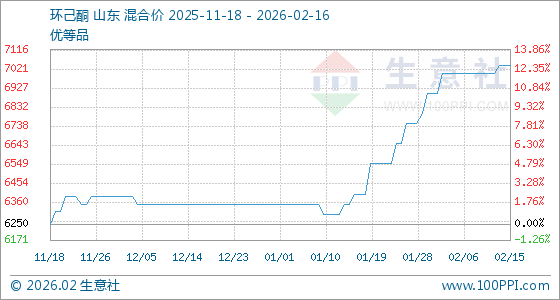 2月16日,生意社环己酮基准价为7037.50元/吨,与本月初(6900.00元/吨)相比,上涨了1.99%。