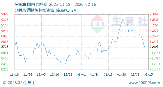 2月16日,生意社棕榈油基准价为8690.00元/吨,与本月初(9196.00元/吨)相比,下降了5.5%。
