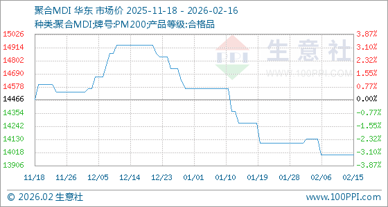 2月16日,生意社聚合MDI基准价为14000.00元/吨,与本月初(14100.00元/吨)相比,下降了0.71%。