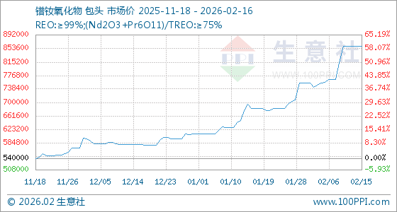 2月16日,生意社镨钕氧化物基准价为860000.00元/吨,与本月初(755000.00元/吨)相比,上涨了13.91%。