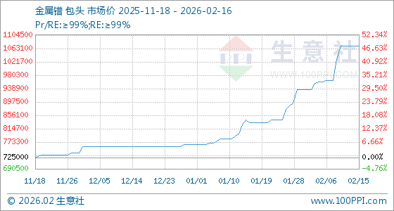 2月16日,生意社金属镨基准价为1070000.00元/吨,与本月初(935000.00元/吨)相比,上涨了14.44%。