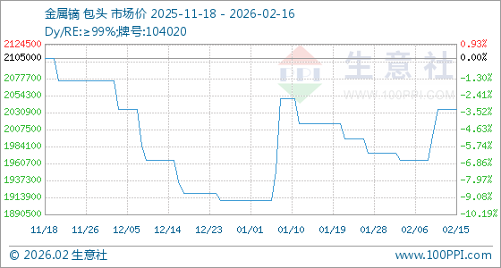 2月16日,生意社金属镝基准价为2035000.00元/吨,与本月初(1975000.00元/吨)相比,上涨了3.04%。