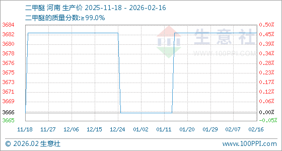 2月16日,生意社二甲醚基准价为3683.33元/吨,与本月初持平。