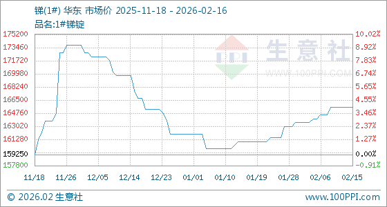 2月16日,生意社锑(1#)基准价为165500.00元/吨,与本月初(163500.00元/吨)相比,上涨了1.22%。