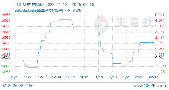2月16日,生意社TDI基准价为14500.00元/吨,与本月初(14166.67元/吨)相比,上涨了2.35%。