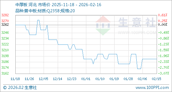 2月16日,生意社中厚板基准价为3192.00元/吨,与本月初(3202.00元/吨)相比,下降了0.31%。