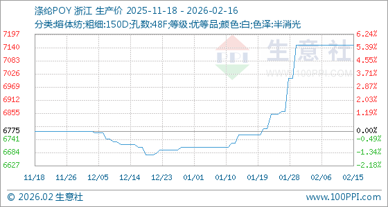 2月16日,生意社涤纶POY基准价为7150.00元/吨,与本月初持平。