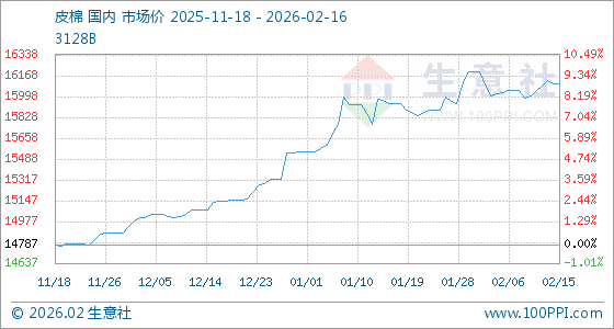 2月16日,生意社皮棉基准价为16105.33元/吨,与本月初(16196.50元/吨)相比,下降了0.56%。