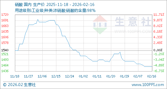 2月16日,生意社硝酸基准价为1460.00元/吨,与本月初(1486.67元/吨)相比,下降了1.79%。