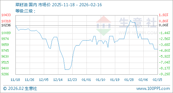 2月16日,生意社菜籽油基准价为9780.00元/吨,与本月初(10298.00元/吨)相比,下降了5.03%。