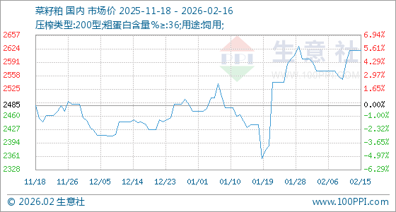 2月16日,生意社菜籽粕基准价为2620.00元/吨,与本月初(2600.00元/吨)相比,上涨了0.77%。