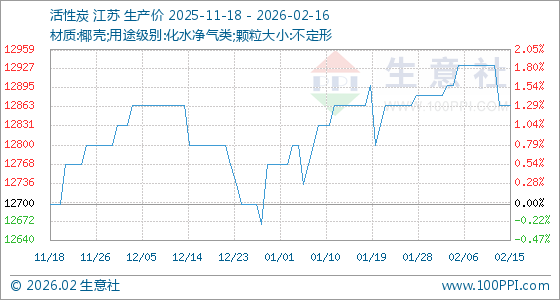 2月16日,生意社活性炭基准价为12866.67元/吨,与本月初(12883.33元/吨)相比,下降了0.13%。