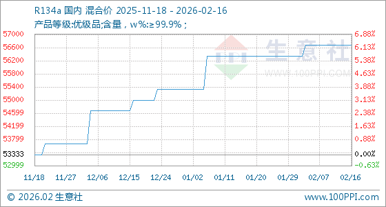 2月16日,生意社R134a基准价为56666.67元/吨,与本月初(56333.33元/吨)相比,上涨了0.59%。