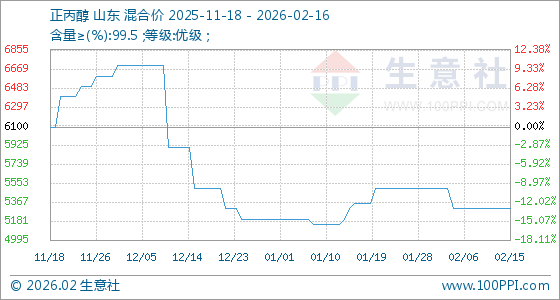 2月16日,生意社正丙醇基准价为5300.00元/吨,与本月初(5500.00元/吨)相比,下降了3.64%。