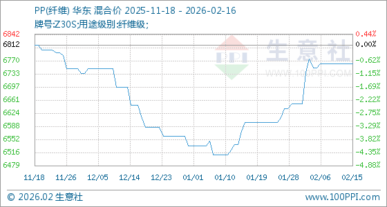 2月16日,生意社PP(纤维)基准价为6762.50元/吨,与本月初(6650.00元/吨)相比,上涨了1.69%。