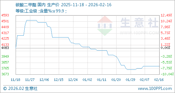 2月16日,生意社碳酸二甲酯基准价为3800.00元/吨,与本月初(3750.00元/吨)相比,上涨了1.33%。