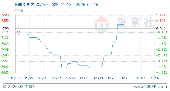 2月16日,生意社MIBK基准价为7266.67元/吨,与本月初持平。