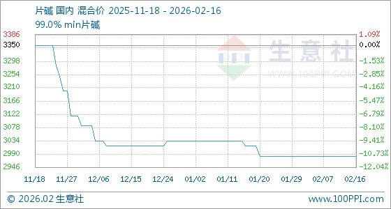 2月16日,生意社片碱基准价为2983.33元/吨,与本月初持平。