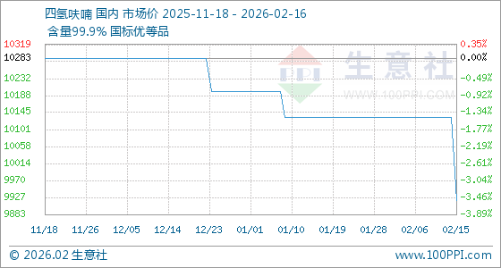 2月16日,生意社四氢呋喃基准价为9920.00元/吨,与本月初(10133.33元/吨)相比,下降了2.11%。