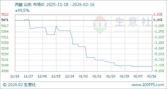 2月16日,生意社丙酸基准价为5040.00元/吨,与本月初(5046.25元/吨)相比,下降了0.12%。