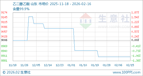 2月16日,生意社乙二醇乙醚基准价为8906.25元/吨,与本月初持平。