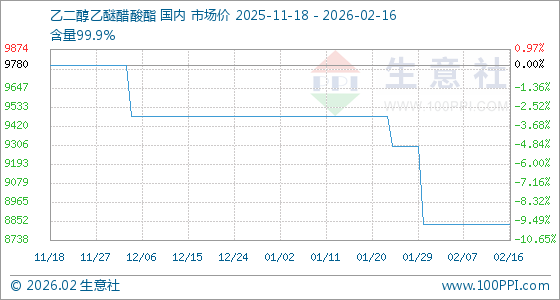 2月16日,生意社乙二醇乙醚醋酸酯基准价为8833.33元/吨,与本月初持平。