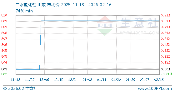 2月16日,生意社二水氯化钙基准价为810.00元/吨,与本月初持平。