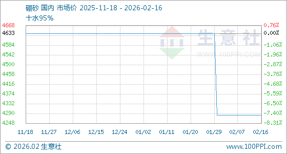 2月16日,生意社硼砂基准价为4283.33元/吨,与本月初持平。