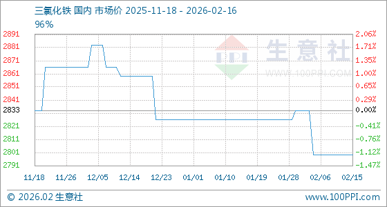 2月16日,生意社三氯化铁基准价为2800.00元/吨,与本月初(2833.33元/吨)相比,下降了1.18%。