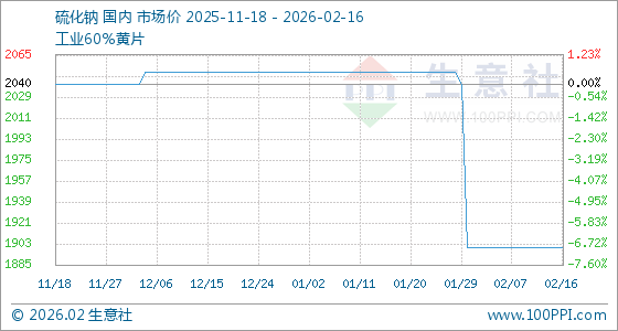 2月16日,生意社硫化钠基准价为1900.00吨,与本月初持平。