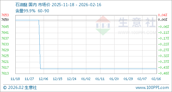 2月16日,生意社石油醚基准价为7616.67元/吨,与本月初持平。