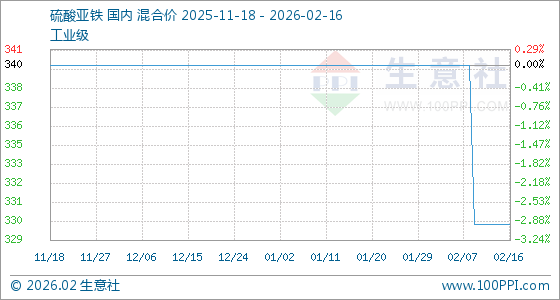 2月16日,生意社硫酸亚铁基准价为330.00元/吨,与本月初(340.00元/吨)相比,下降了2.94%。