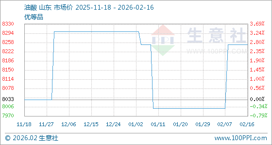 2月16日,生意社油酸基准价为8250.00元/吨,与本月初(8000.00元/吨)相比,上涨了3.12%。