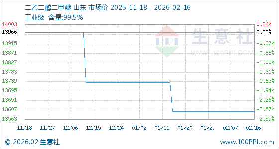 2月16日,生意社二乙二醇二甲醚基准价为13600.00元/吨,与本月初持平。