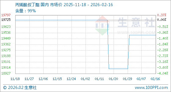 2月16日,生意社丙烯酸叔丁酯基准价为19500.00元/吨,与本月初持平。