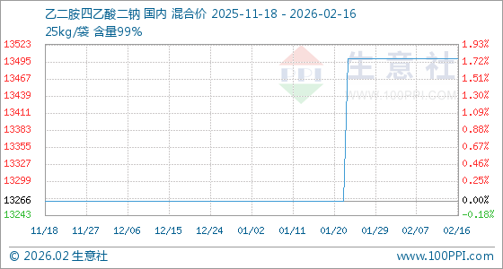 2月16日,生意社乙二胺四乙酸二钠基准价为13500.00元/吨,与本月初持平。