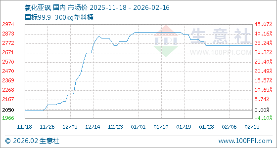 2月16日,生意社氯化亚砜基准价为2750.00元/吨,与本月初持平。