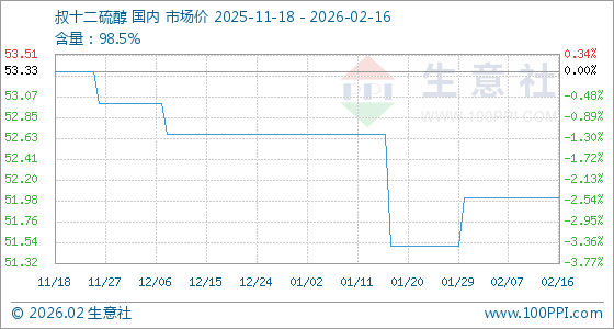 2月16日,生意社叔十二硫醇基准价为52.00元/千克,与本月初持平。