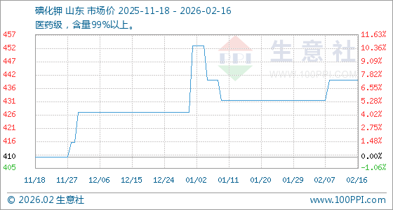 2月16日,生意社碘化钾基准价为440.00元/公斤,与本月初(432.00元/公斤)相比,上涨了1.85%。