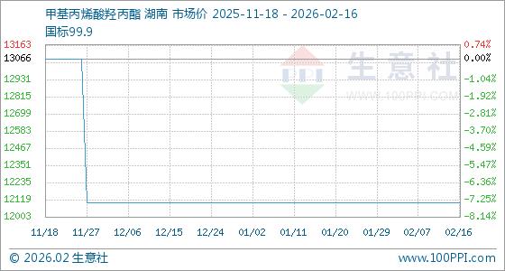 2月16日,生意社甲基丙烯酸羟丙酯基准价为12100.00元/吨,与本月初持平。