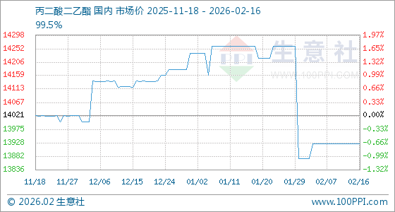 2月16日,生意社丙二酸二乙酯基准价为13925.00元/吨,与本月初(13875.00元/吨)相比,上涨了0.36%。