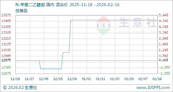 2月16日,生意社N-甲基二乙醇胺基准价为13500.00元/吨,与本月初持平。