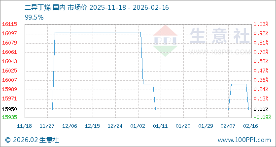 2月16日,生意社二异丁烯基准价为15950.00元/吨,与本月初持平。