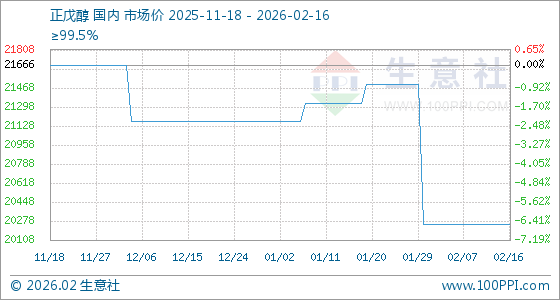 2月16日,生意社正戊醇基准价为20250.00元/吨,与本月初持平。
