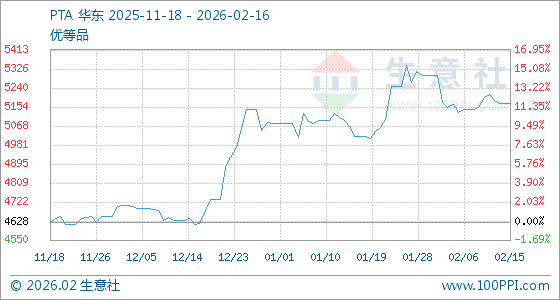 2月16日,生意社PTA基准价为5168.50元/吨,与本月初(5298.83元/吨)相比,下降了2.46%。
