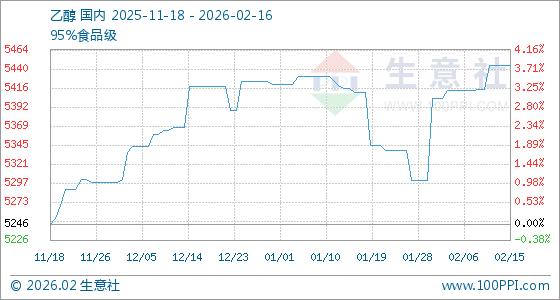 2月16日,生意社乙醇基准价为5444.45元/吨,与本月初(5403.33元/吨)相比,上涨了0.76%。