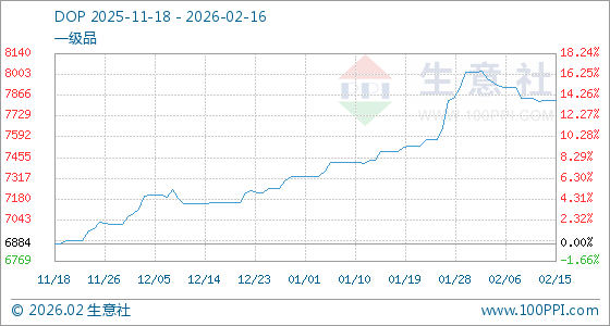 2月16日,生意社DOP基准价为7833.34元/吨,与本月初(8017.50元/吨)相比,下降了2.3%。