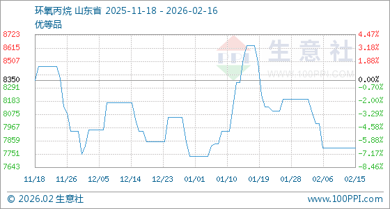 2月16日,生意社环氧丙烷基准价为7800.00元/吨,与本月初(8200.00元/吨)相比,下降了4.88%。