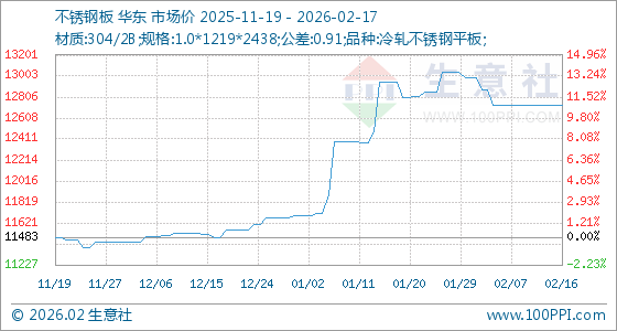 2月17日,生意社不锈钢板基准价为12725.00元/吨,与本月初(12991.67元/吨)相比,下降了2.05%。